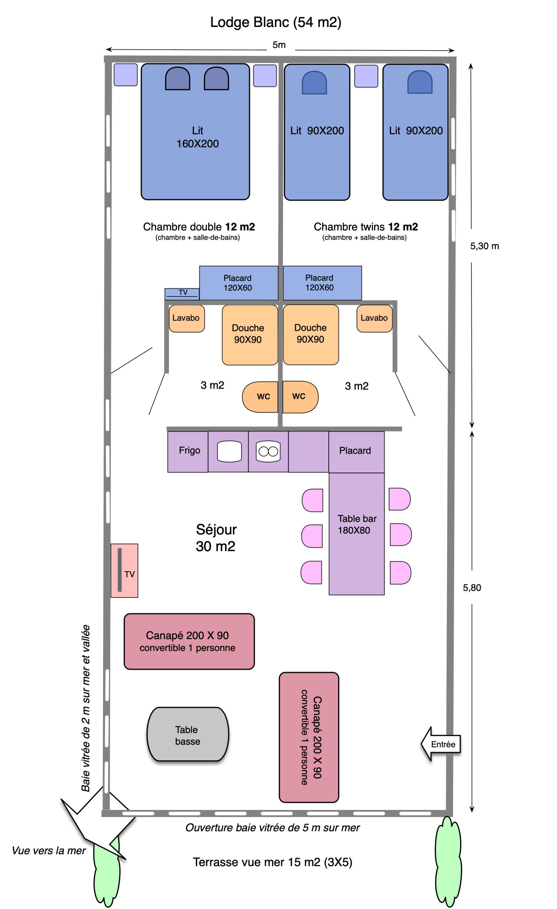 - Séjour (30 m2) : 2 canapés convertibles de 90X200cm), table basse, placard, TV, lecteur de DVD, enceinte Bluetooth, baies vitrées de 5m, rideaux occultants.