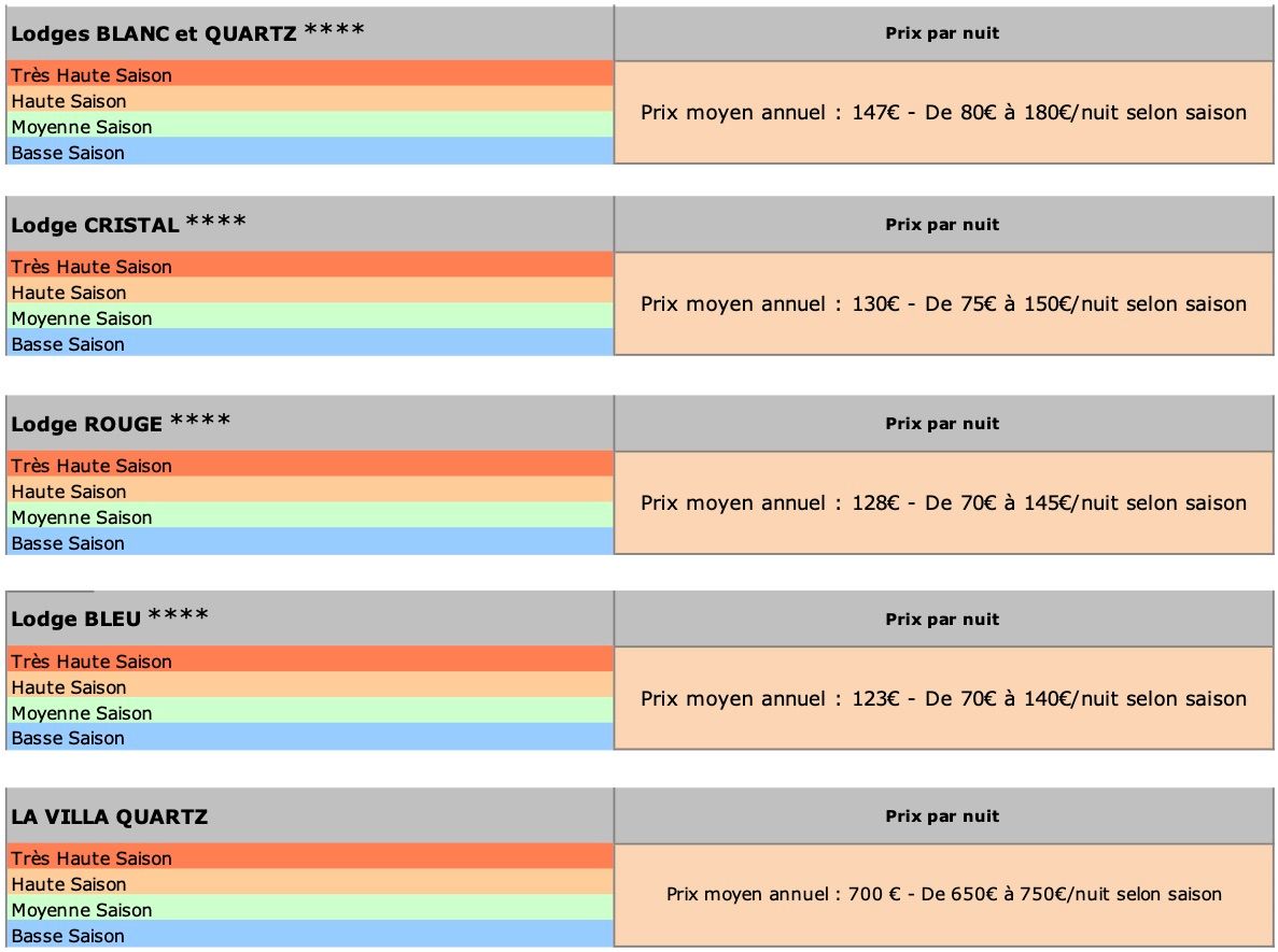 Les tarifs indiqués dans le tableau ci-dessus sont nos prix directs, sans intermédiaire ni commissions d'agence, et hors promotions éventuelles. Ils sont donnés à titre uniquement indicatif, car ils varient en fonction de la demande, de la saison et de nos campagnes de promotion. Nous pratiquons en effet la tarification dynamique. Pour obtenir un devis immédiat et précis, cliquez sur le bouton "Je Réserve".