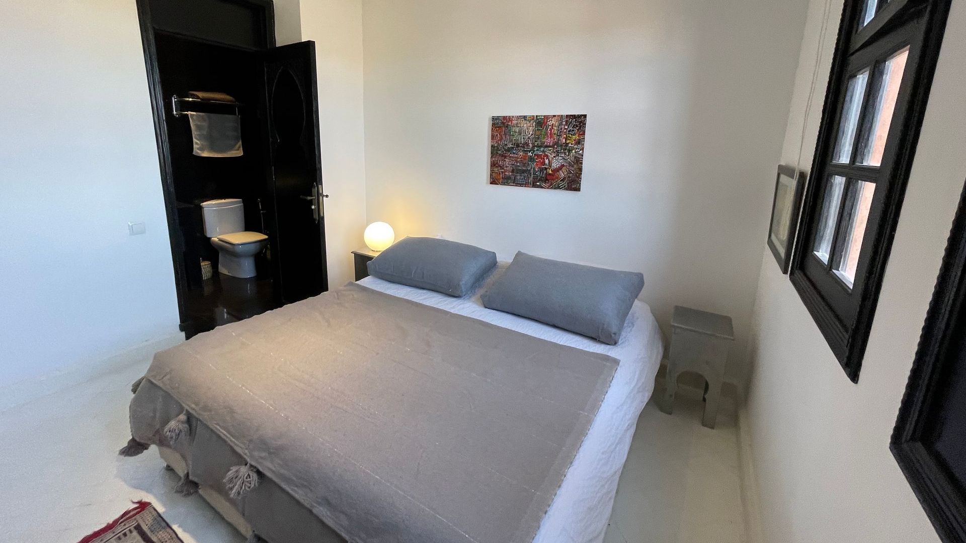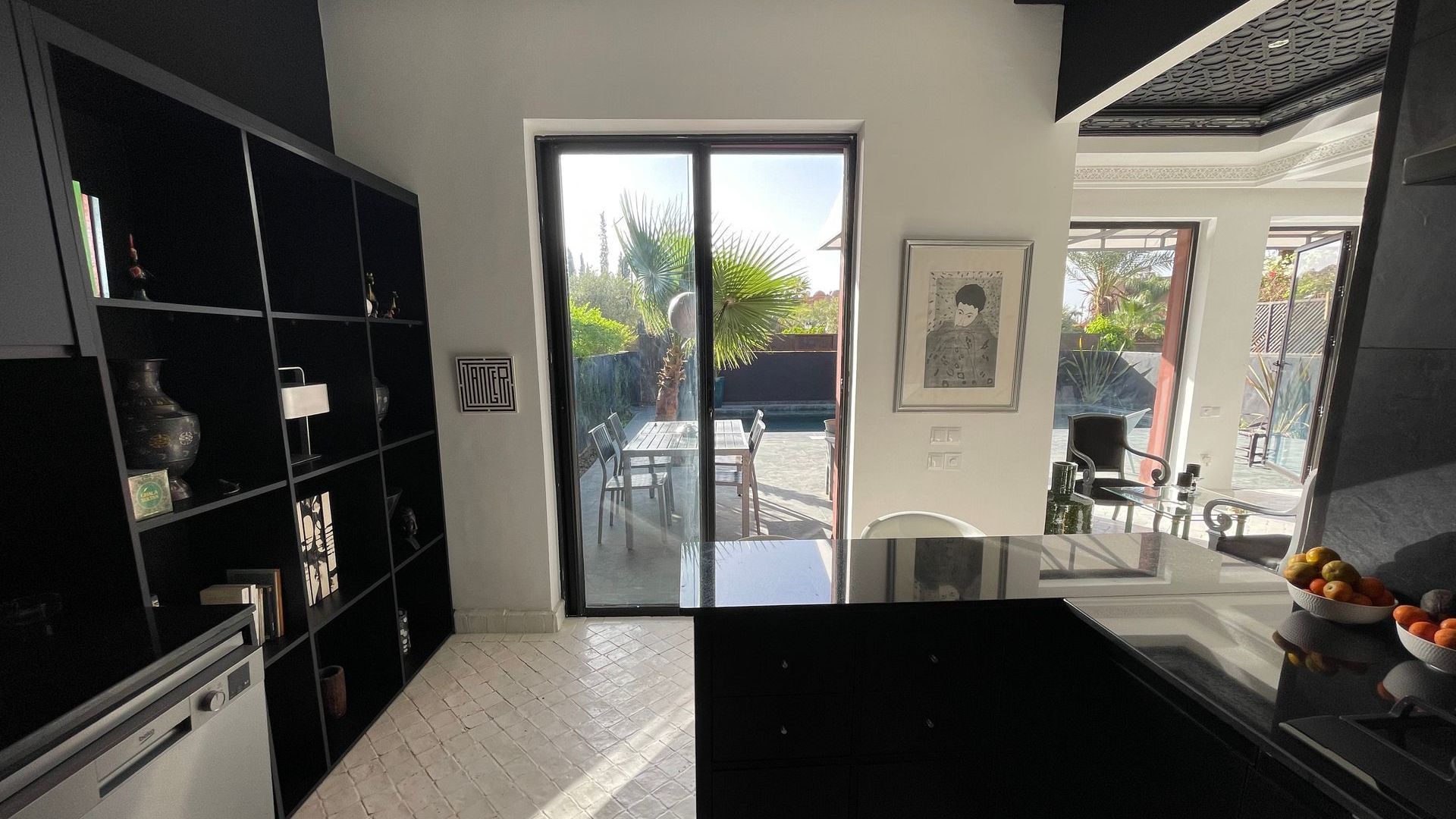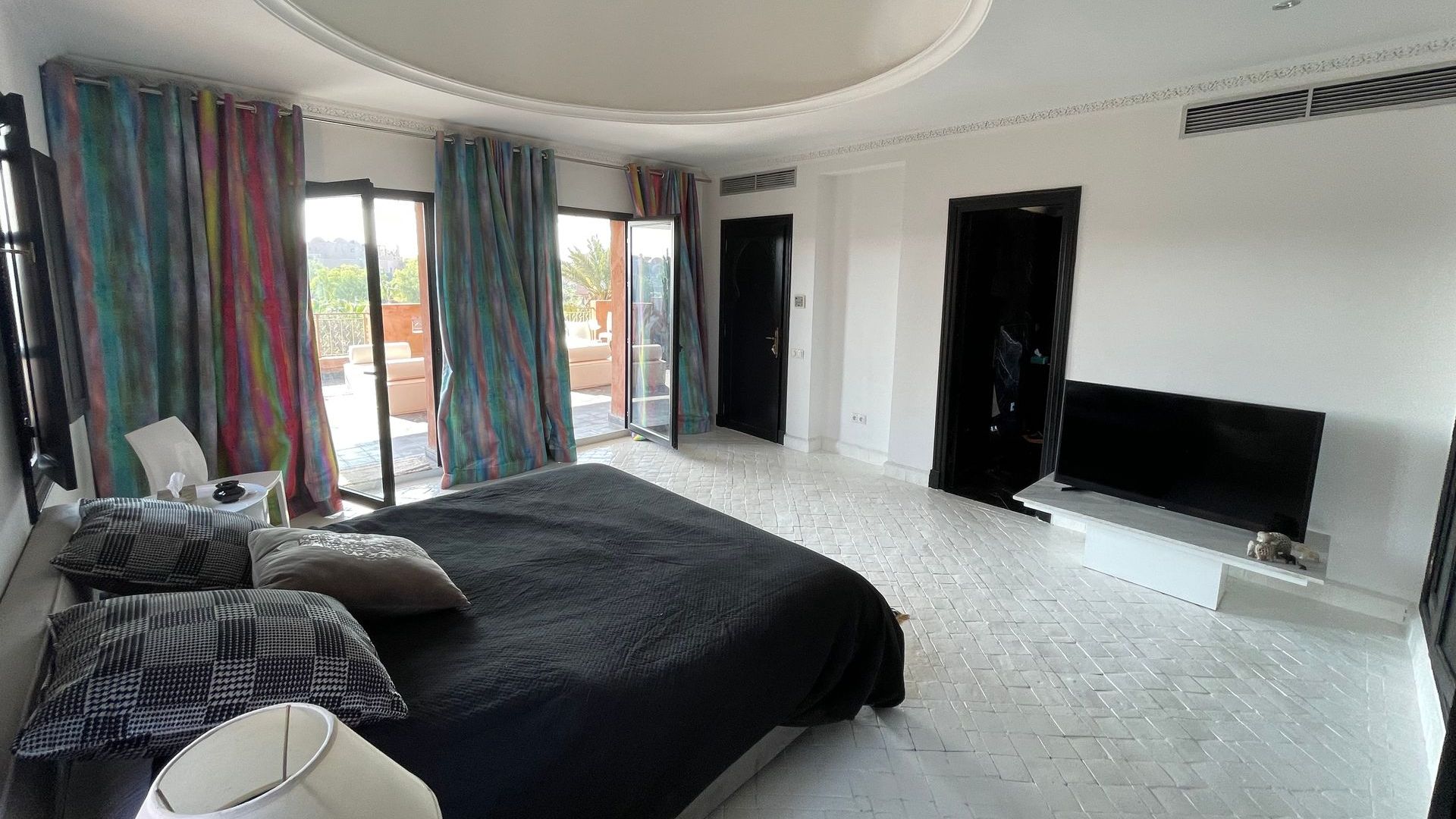 Villa 2A liegt 5 Minuten nördlich von Marrakesch, in einer sehr ruhigen und sicheren Residenz: der Residenz River Palm. Es bietet eine Wohnfläche von 250m2 und eine Gartenterrasse von 150m2 mit einem großen Swimmingpool (10mX3,50m). SDas geräumige Wohnzimmer (80 m²), hell und komfortabel (Wohnzimmer, Kamin, angeschlossener Fernseher, Lautsprecher), ist durch große Erkerfenster zum Pool hin offen. Es bietet bequem Platz für bis zu 6 Personen in seinen drei Schlafzimmern, von denen jedes über ein eigenes Badezimmer mit Dusche und Toilette verfügt: eine 35 m² große Schlafzimmersuite im Obergeschoss, die sich auf eine große Terrasse öffnet, und zwei 15 m² große Schlafzimmer im Erdgeschoss. Die Küche der Villa ist komplett ausgestattet (Öfen, Geschirrspüler, amerikanischer Kühlschrank, Geräte usw.). Im Obergeschoss ermöglicht Ihnen eine ausgestattete Panoramaterrasse, den Atlas am Horizont zu entdecken, mit einem magischen und entspannenden Blick auf die luxuriösen Gärten der Residenz.