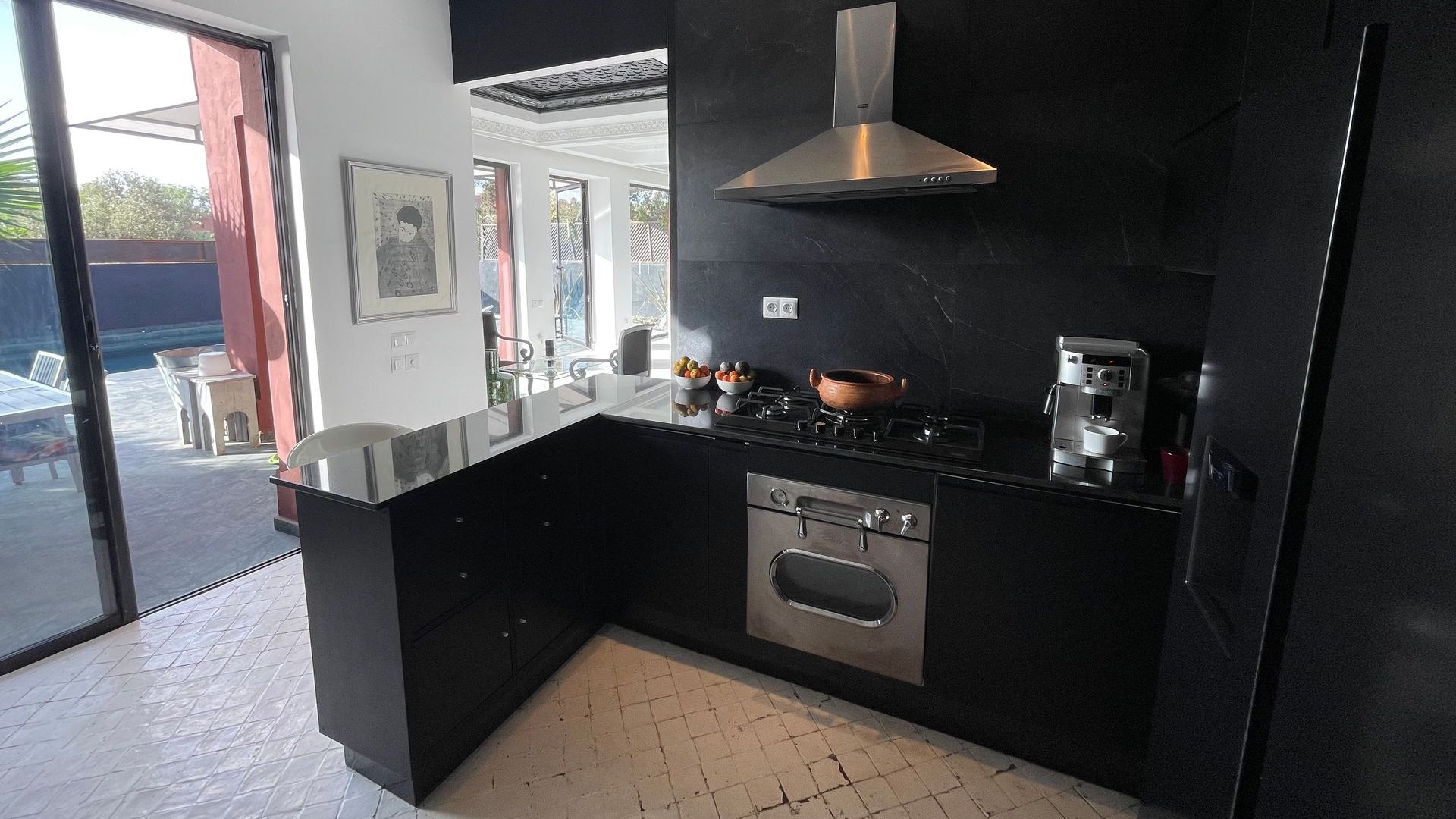 Die Küche der Villa ist offen zum Wohnzimmer und zur Terrasse. Es ist komplett ausgestattet mit Gasherd, amerikanischem Kühlschrank, konventionellen und Mikrowellenherden, Nespresso- und Getreidekaffeemaschinen, Geschirrspüler, kleinen Haushaltsgeräten usw. Es hat auch eine kleine Terrasse mit einem hohen Tisch und Stühlen für Mittag- oder Abendessen im Freien im Schatten einer Palme.