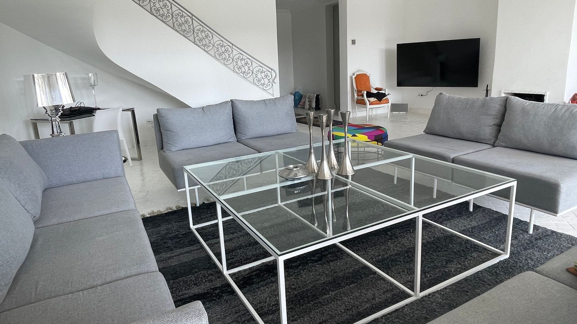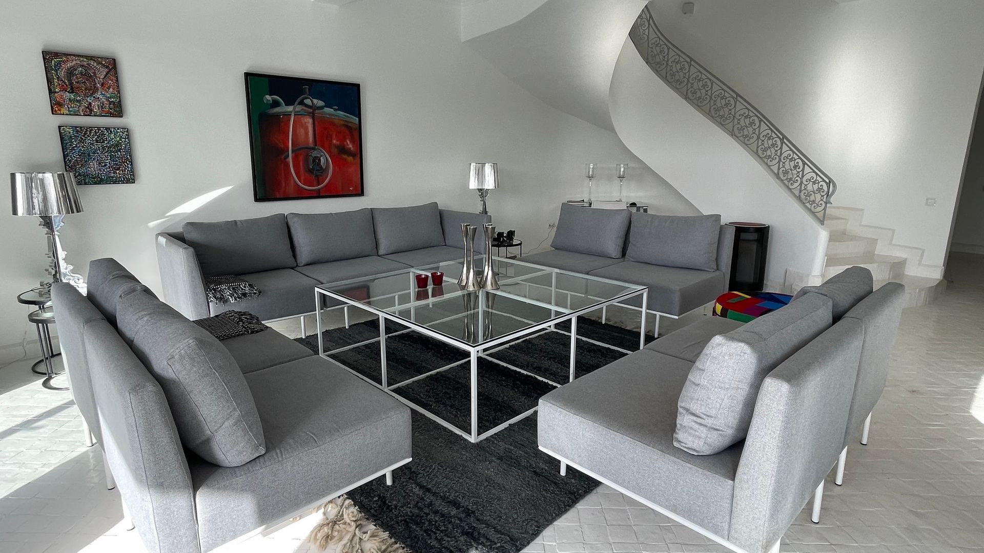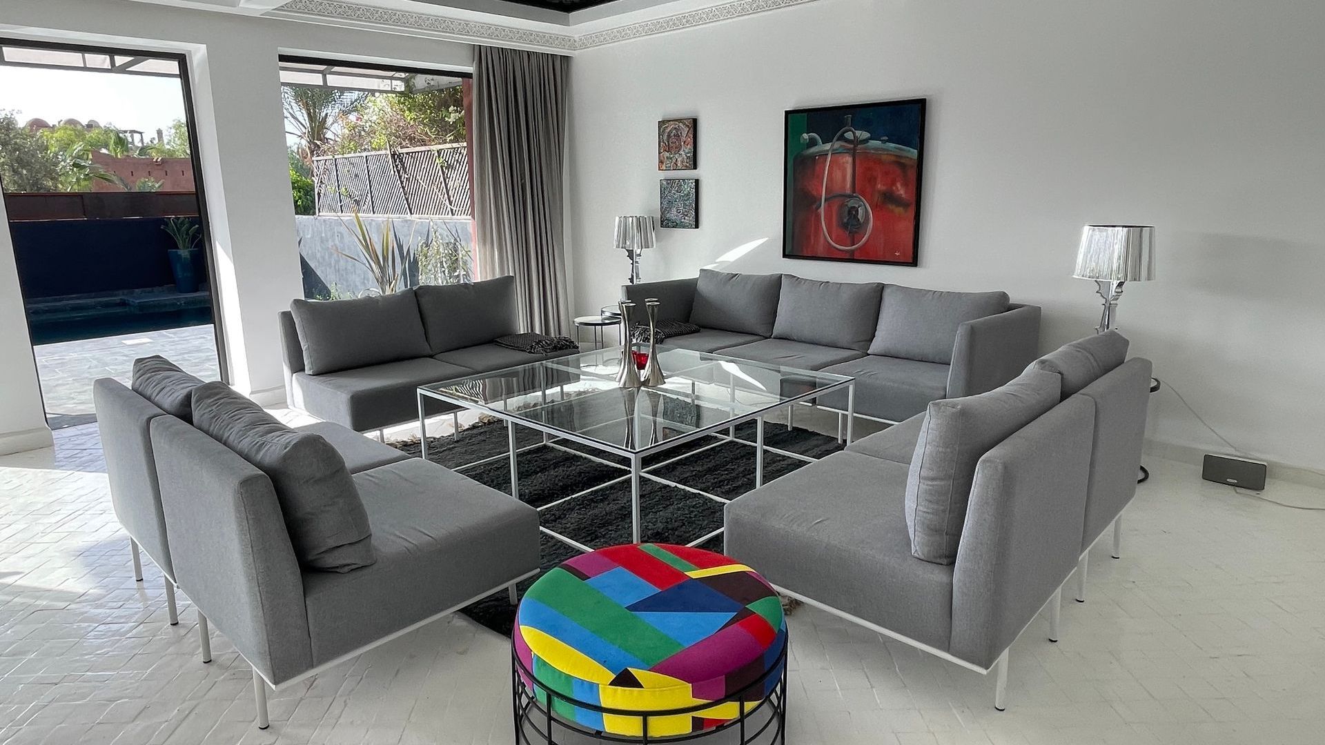 Das Wohnzimmer der Villa ist geräumig (80m2) und öffnet sich durch große Erkerfenster zur Terrasse und zum Swimmingpool. Unseren Gästen steht ein großer Loungebereich (80 m²) mit Sofas und einem Couchtisch zur Verfügung, um Mahlzeiten im "marokkanischen Stil" einzunehmen. Ein Kamin trägt dazu bei, die Atmosphäre an kühlen Winterabenden zu erwärmen, und ein großer vernetzter Fernseher hält Sie offen für die Welt (Zugriff auf alle internationalen Programme, Netflix, Canal usw.)! Internet-Enthusiasten können problemlos weiter surfen, da die Glasfaser installiert und das WLAN in der gesamten Villa verfügbar ist.