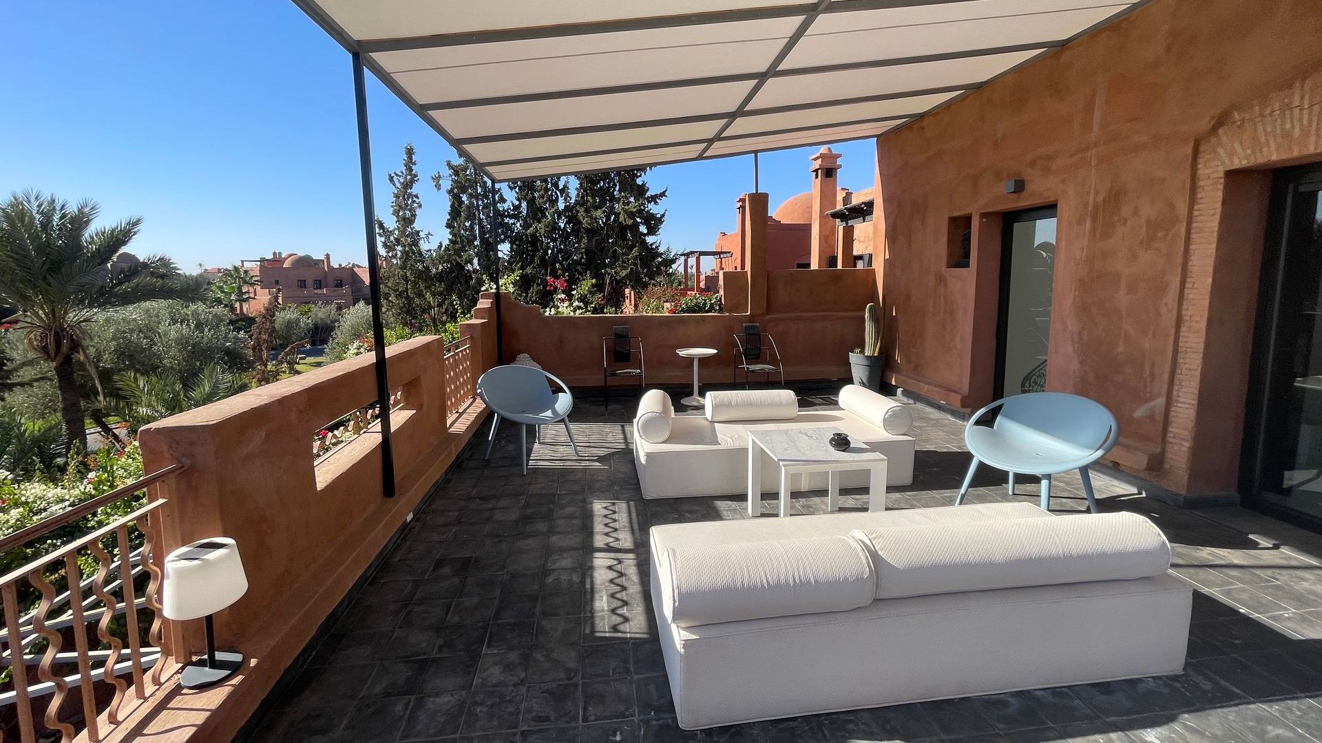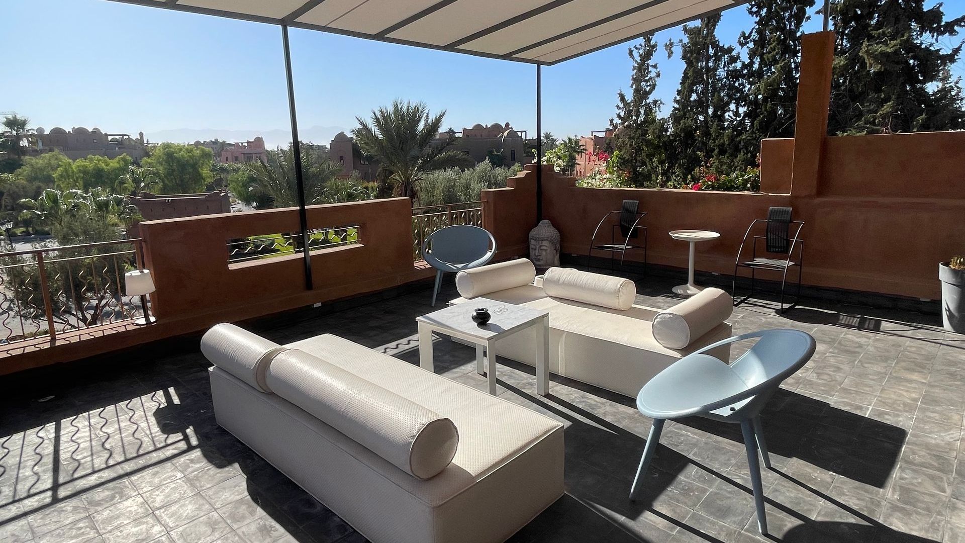 - Panoramaterrasse von 40m2im 1. Stock mit Blick auf die Gärten der Residenz und den Atlas.