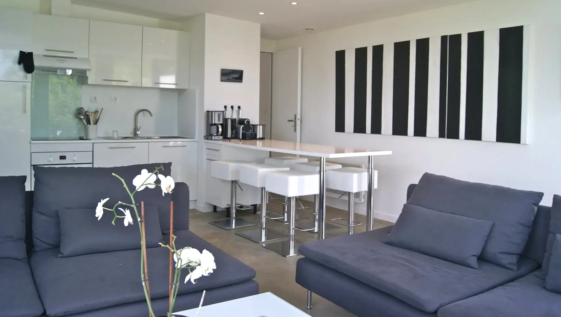 Con i suoi 55 m2, l'appartamento Bianco è il più spazioso di Villa Quartz. Può ospitare fino a 6 persone (di cui 2 nel soggiorno). Il colore bianco è predominante. Il bianco che purifica rilassa per aprirsi a nuove energie! L'appartamento offre una vista rara e impressionante sul mare e sulle frastagliate scogliere della Costa d'Alabastro. Il suo soggiorno di 30 m2 è ampiamente aperto al mare, alla spiaggia e alle scogliere attraverso 7 metri di finestre panoramiche. La cucina è integrata nel soggiorno con un ampio bancone centrale e l'area salotto offre 2 comodi divani con TV LED, impianto stereo, di fronte alla terrazza di 15m2. L'appartamento Bianco dispone di 2 camere da letto, ciascuna con TV, e di 2 bagni. Il comfort "Top" con una classificazione in 4 stelle.