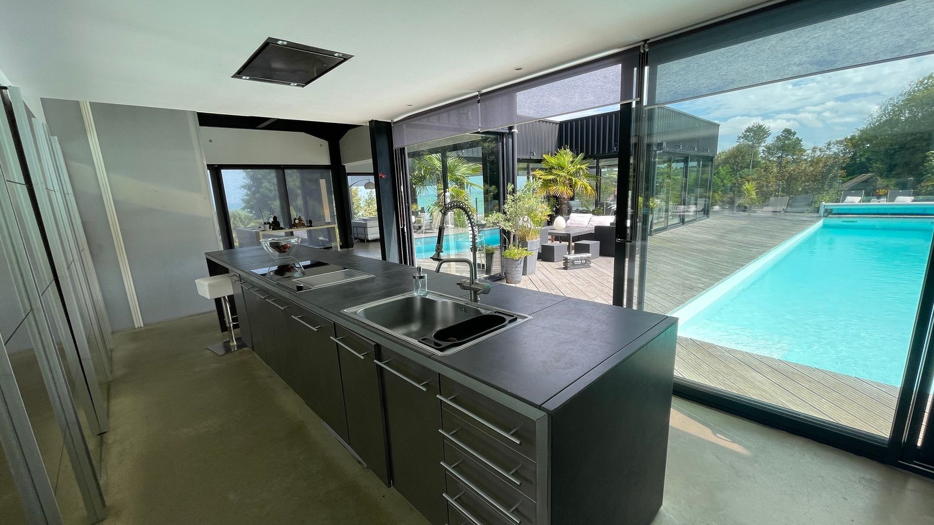 La cucina completamente attrezzata si apre sulla terrazza panoramica e sulla piscina.