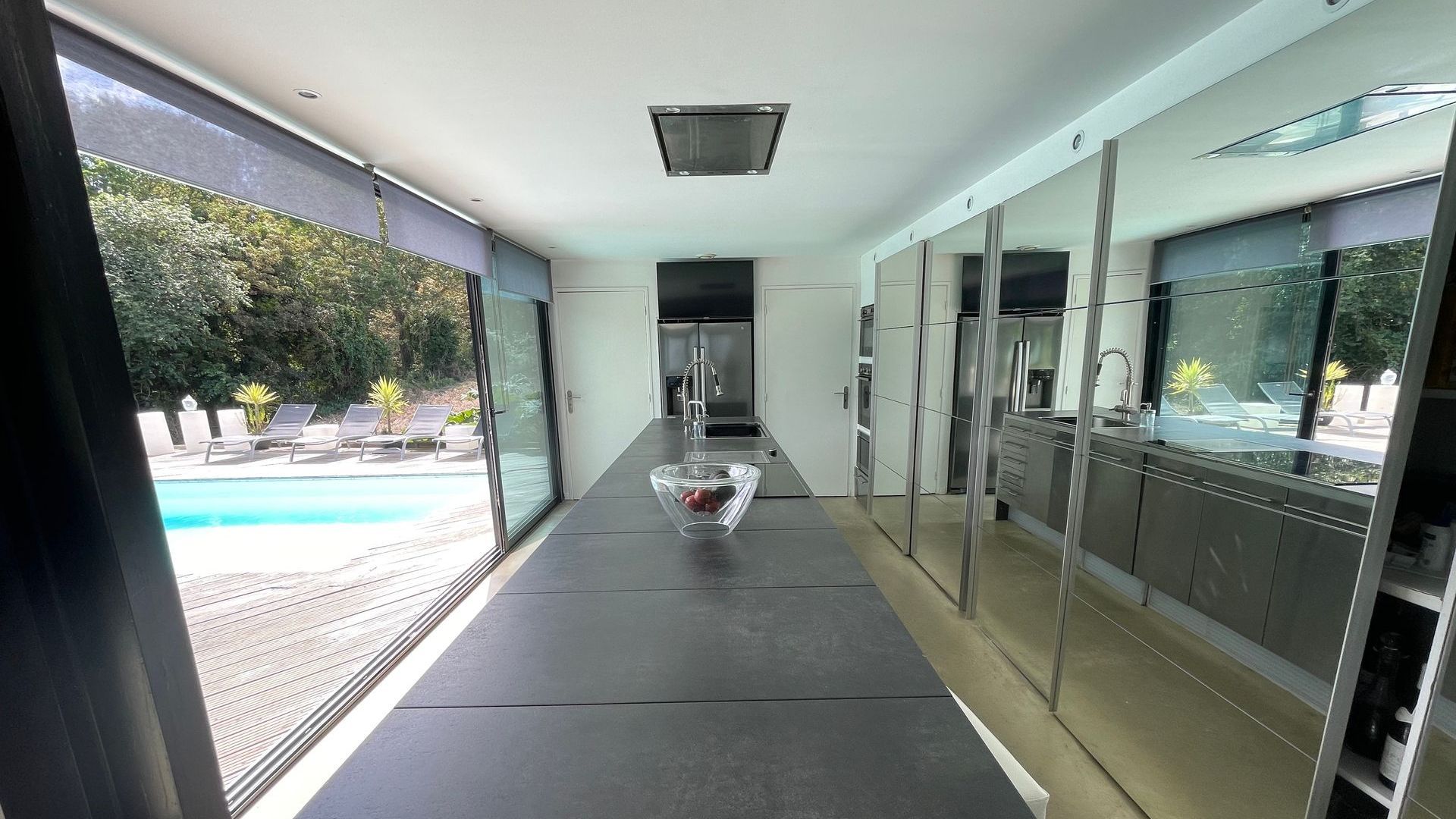 Un espace à vivre de plus de 450 m2 : la Villa (200m2) et la terrasse panoramique (250 m2) plein Sud avec sa piscine de 16m X 3,50m, le pool house et les salons extérieurs.