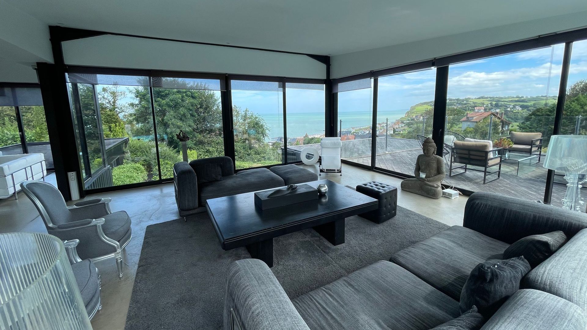 - Séjour (100 m2) : entrée de 36m2, 2 salons de 36m2 chacun avec tables, canapés et fauteuils. Poèle à bois. Vue panoramique sur la mer, les falaises et la plage de pourville.