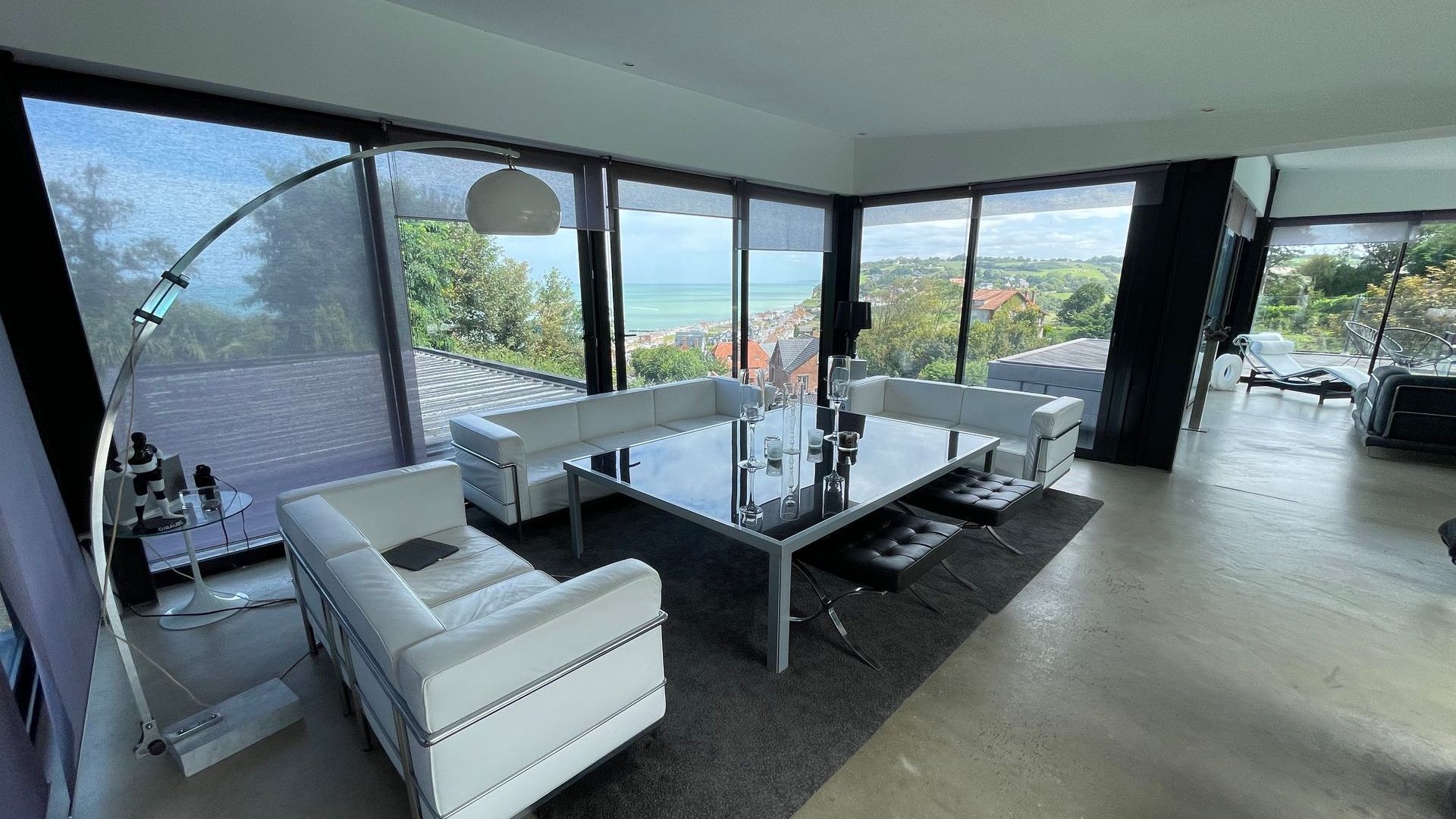 - Woonkamer (100 m2): entree van 36 m2, 2 salons van elk 36 m2 met tafels, banken en fauteuils. Houtkachel. Panoramisch uitzicht op de zee, de kliffen en het strand van Pourville.