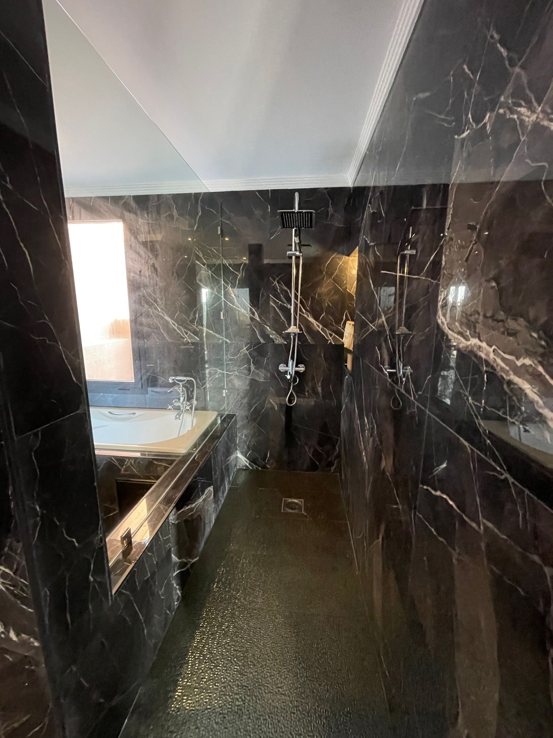 Villa 2A ligt 5 minuten ten noorden van Marrakech, in een zeer rustige en veilige residentie: de residentie River Palm. Het biedt een woonoppervlakte van 250m2 en een tuinterras van 150m2 met een groot zwembad (10mX3.50m). Se ruime woonkamer (80m2), licht en comfortabel (woonkamer, open haard, aangesloten TV, speakers), staat in open verbinding met het zwembad door grote erkers. Elle peut accueillir confortablement jusqu'à 6 personnes dans ses trois chambres, qui disposent chacune de leur propre salle de bain avec douche et wc : une chambre-suite de 35m2 à l'étage ouverte sur une grande terrasse, et deux chambres de 15m2 au begane grond. De keuken van de Villa is volledig uitgerust (ovens, vaatwasser, Amerikaanse koelkast, toestellen, enz.). Boven kunt u op een uitgerust panoramisch terras de Atlas aan de horizon ontdekken, met een magisch en rustgevend uitzicht op de luxueuze tuinen van de residentie.